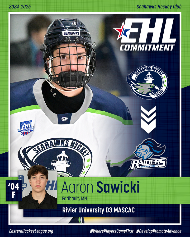 Aaron Sawicki, a forward for the Seahawks Hockey Club's EHL team has committed to Rivier University for the 2025-2026 season.