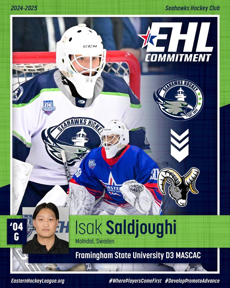 Isak Saldjoughi, a goaltender for the Seahawks Hockey Club EHL team, has committed to Framingham State University for the 2025-2026 season.
