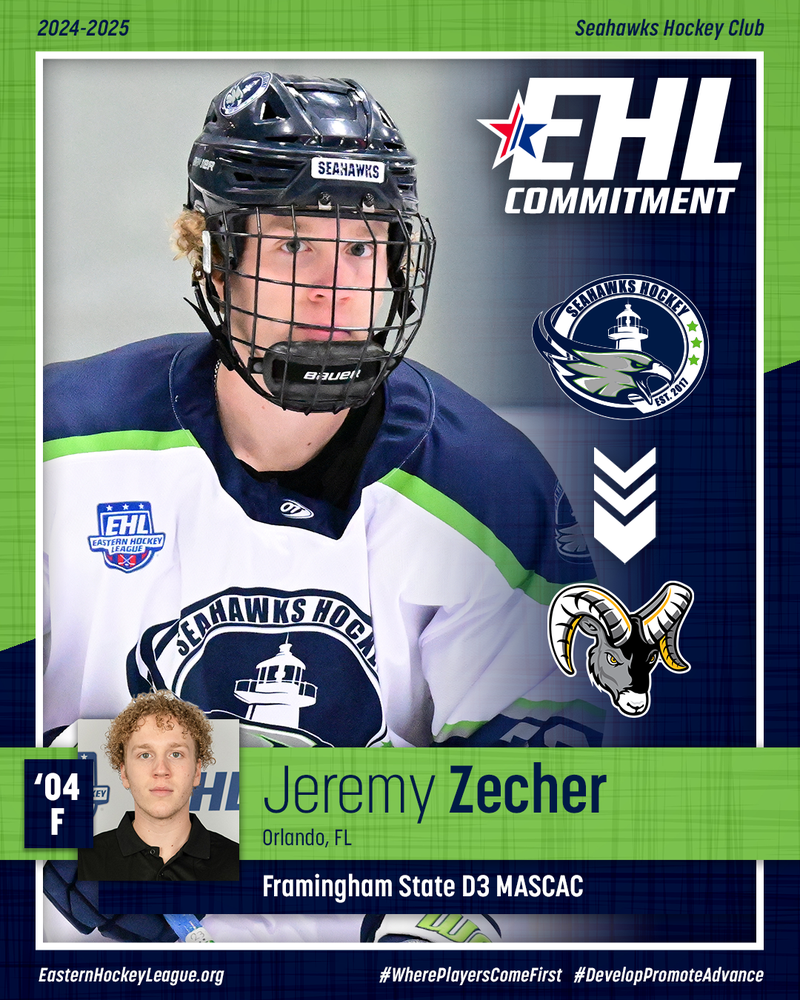 Jeremy Zecher, a forward for the Seahawks Hockey Club EHL team, has committed to Framingham State University (FSU) for the Fall of 2025.