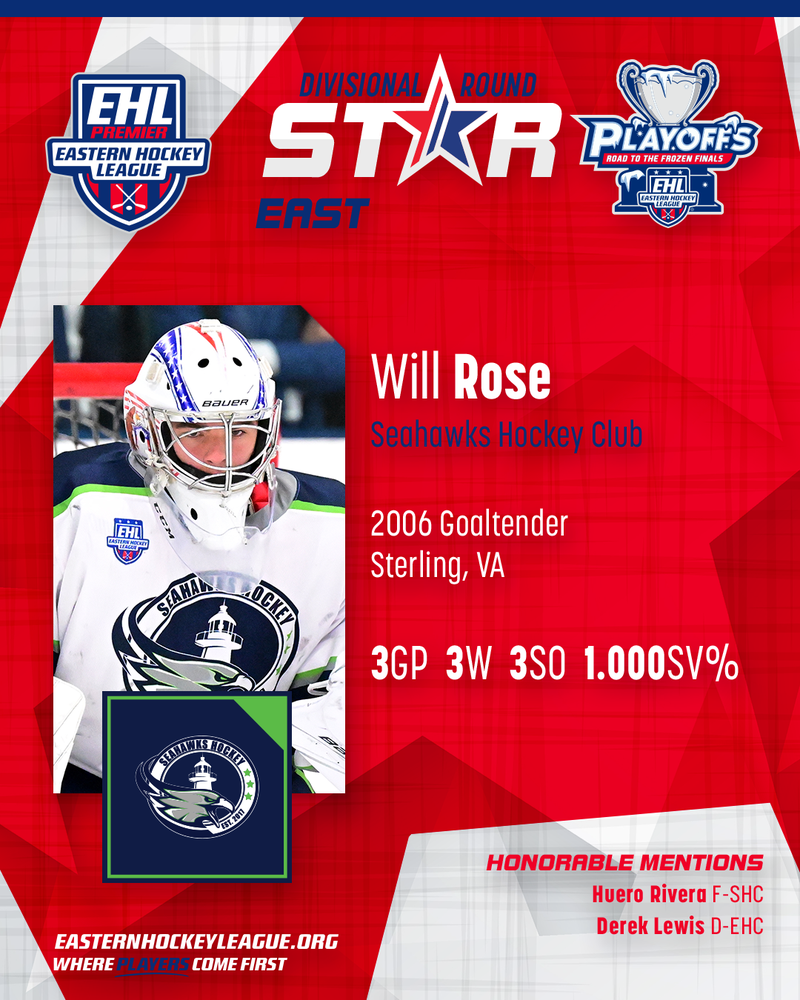 The EHLP is pleased to announce goaltender Will Rose of the Seahawks Hockey Club as the Divisional Star for the East Division. An 06’ out of Sterling, VA, Rose continues to cement himself as a star goaltender in his rookie campaign. With 180 minutes of playoff hockey behind him, Rose has not conceded a single goal against. Tallying 38 saves total in his first two postseason games, Rose faced his toughest challenge in game two against the Express Hockey Club. With a tenuous one goal lead, Rose blanked 29 of 29 Express attempts, sending his team to the Northeast Regional Finals to take on the number one in the league, New England Wolves. Rose was amongst the best of the best in the regular season as well, sporting a .942 save percentage in seventeen games, earning an All-EHLP team nod.